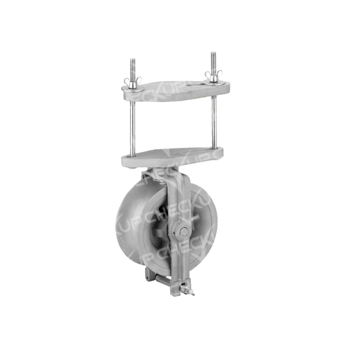Roldana para lançamento de cabo A.T. até 336,4 MCM. Roldana de base giratória com engraxadeira. Eixos montados com 2 rolamentos blindados. Encaixe regulável para cruzetas. Trava de proteção para o cabo. Polia com acabamento do colo polido. Fabricada em alumínio liga, pinos, parafusos e eixo central de aço.